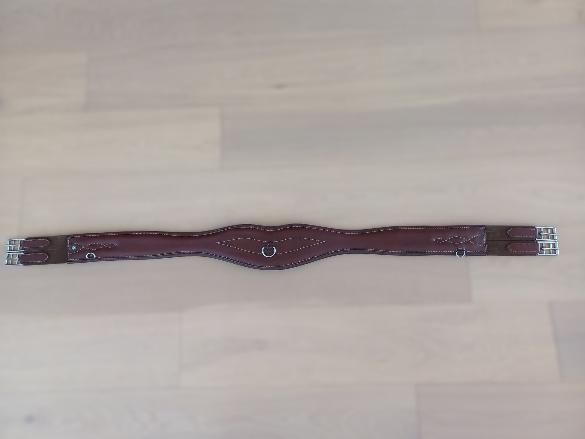 Pratique et confortable, cette sangle LJ brune de 145 cm assure une excellente stabilité de la selle tout en garantissant confort et sécurité pour le cheval.